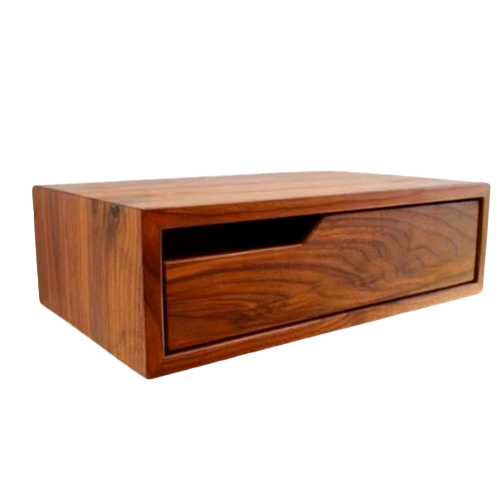 Buro de un cajón, mide 50cm x 30cm x 20cm para fijarse directo a muro o a una cabecera lisa de madera. Su acabado resalta la textura y el color de la madera, aportando calidez a tu espacio.